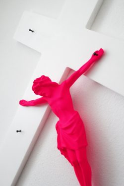 Kruzifix-Bausatz: ein Kreuz, eine neon-pinke Jesus-Figur, drei Nägel Als „massenkonfektionierte Fast-Food-Variante“ ist der Anschlag auch ohne Kreuz, aber getütet, „von der Stange“, zu haben.