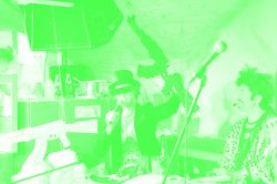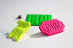 Der INRI-Schriftzug, entnommen von ausgedienten Kruzifixen, mit kleinen Nägeln und Sonderangebotsfarbe versehen, wird zu einem Ansteck-Logo wiederverwertet – Selbststigmatisierung als Modebekenntnis. - Peng