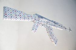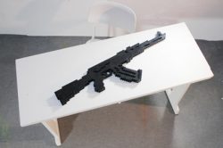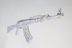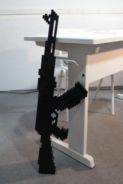 „Peng“, bestehend aus 928 identischen Legosteinen, stellt ein 3-dimensional verpixeltes AK47-Maschinengewehr dar – das meist produzierte Maschinengewehr der Welt kombiniert mit dem weltweit bekanntesten Kinder-Spielzeug.