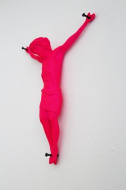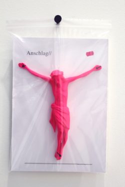 Kruzifix-Bausatz: ein Kreuz, eine neon-pinke Jesus-Figur, drei Nägel Als „massenkonfektionierte Fast-Food-Variante“ ist der Anschlag auch ohne Kreuz, aber getütet, „von der Stange“, zu haben.
