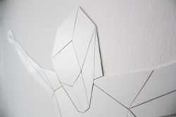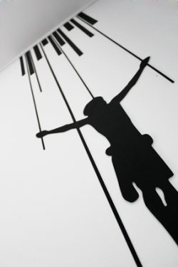 Der scheinheilige Heiligenschein ist ein weißes und somit an der Wand getarntes Kreuz, dass bei Tageslicht einen pinken Schatten an die Wand reflektiert.