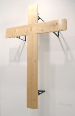 Die Kreuzung zweier Bierbänke zitiert die Kombination zweier Rituale, mit deren Schnittstelle symbolisch gespielt wird: Frühschoppen beim Gottesdienst, Spontan-Kreuzigung beim Familienfest oder als „Beichtstuhl“ mit Präventivwirkung für die vom Alkohol gelockerte Zunge auf dem Volksfest.