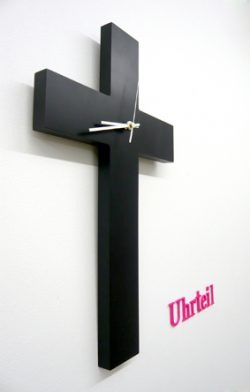 Ein Hilfe suchender Blick nach oben an die Wand — zur Uhr/zum Kreuz. Das Verbinden oder in Frage stellen dieser Gewohnheiten, durch die Kombination von Uhrzeit, christlicher Symbolik und plakativem Schriftzug, sorgt für ein Wechselspiel zwischen Orientierung und Irritation.